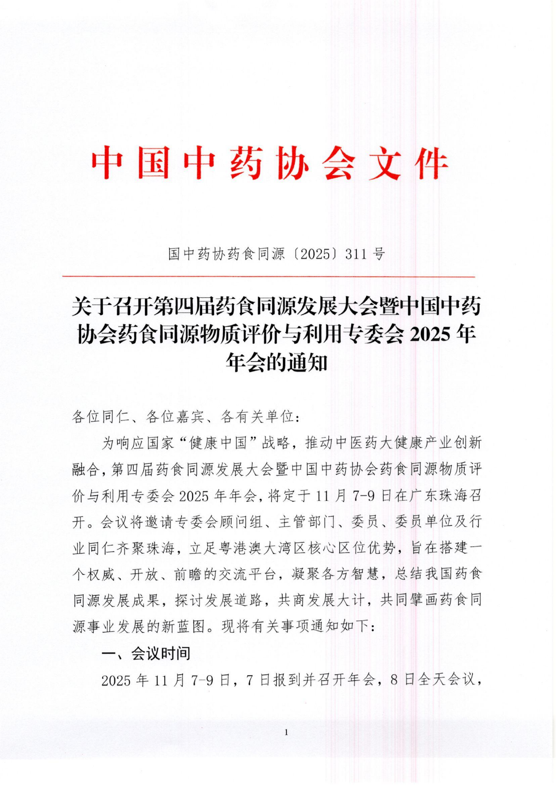 上午好!为推动中医药大健康产业创新融合,第四届药食同源发展大会暨中国中药协会药食同源物质评价与利用专委会2025年年会,将定于11月7-9日在广东珠海召开。会议将邀请专委会顾问组、主管部门、委员、委员单位及行业同仁齐聚珠海,立足粤港澳大湾区核心区位优势,旨在搭建一个权威、开放、前瞻的交流平台,凝聚各方智慧,总结我国药食同源发展成果,探讨发展道路,共商发展大计,共同擘画药食同源事业发展的新蓝图。诚邀各位委员拨冗参加,注册可扫描二维码,期待与您相聚珠海!